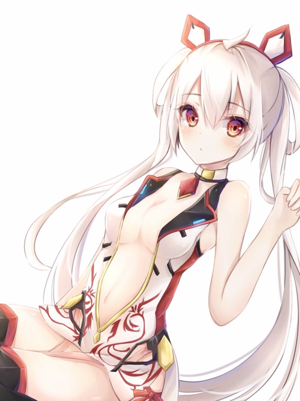 【插画/CG】图片艺术作品#22923(JPG/1200x1600/0.27MB);是由作者「霧せれあ (kiri celea)」创作;图中角色有「マトイ」等;产权归属「梦幻之星」「梦幻之星online2」;关联标签:マトイ,梦幻之星,梦幻之星online2,kiri_celea,呆毛,前发,黑丝,胸部,cleavage,发饰,长发,视线正对,横乳,露脐,红色眼,银发,坐姿,single,双马尾,白背景,matoi (pso2),phantasy star,phantasy star online 2,kiri celea,ahoge,bangs,black legwear,hair ornament,long hair,looking at viewer,medium breasts,navel,red eyes,silver hair,sitting,twintails,white background