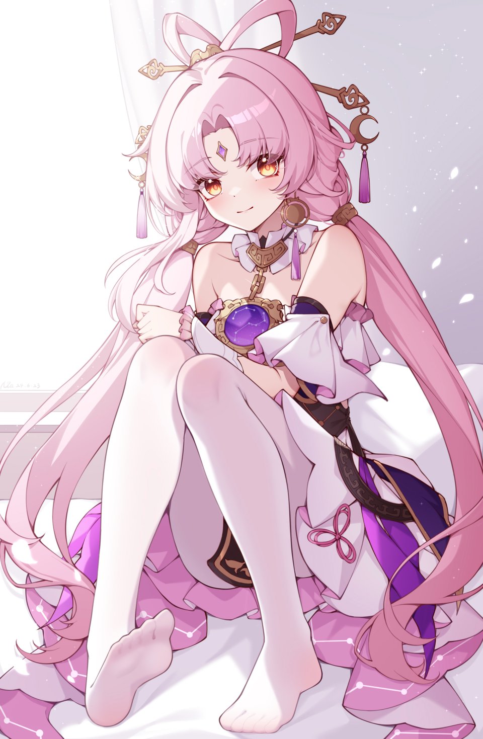 【插画/CG】图片艺术作品#95600(JPG/2000x3062/2.12MB);是由作者「poinia」创作;图中角色有「符玄」等;出自作品「崩坏:星穹铁道」;关联标签:符玄,崩坏:星穹铁道,poinia,露肩,连衣裙,长发,视线正对,裤袜,粉发,坐姿,笑顔,single,双马尾,黄色眼,fu xuan (honkai: star rail),honkai: star rail,bare shoulders,dress,long hair,looking at viewer,pantyhose,pink hair,sitting,smile,twintails,yellow eyes